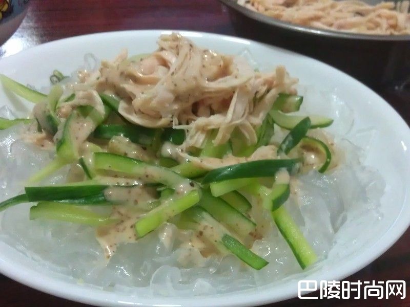 6把粉皮放在底 再放上青瓜, 鸡丝,最后淋上芝麻酱, 拌匀, 完成!
