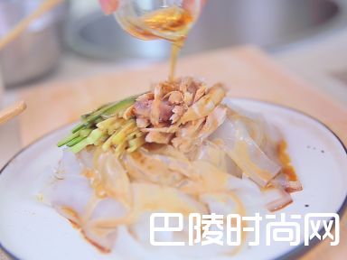 10把粉皮放到盘子上。加上鸡肉和黄瓜。淋上麻辣酱和芝麻酱。既成。