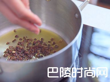 7下一步做麻辣酱。用一个锅,加入油用中火烧热。加入花椒和八角,煮2-3分钟。加入醋,酱油,糖搅拌到糖融化就可以离火。备用。
