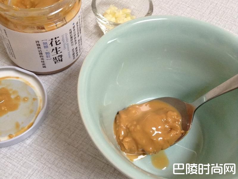 3利用煮面的时间调麻酱。取一个干净的容器,放入原味花生酱一匙。