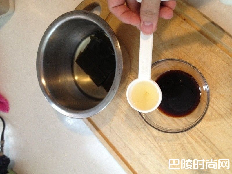 2等水滚时开始调和凉面酱汁,依序放入风味酱油、糖、橄榄油,然后等昆布汁
