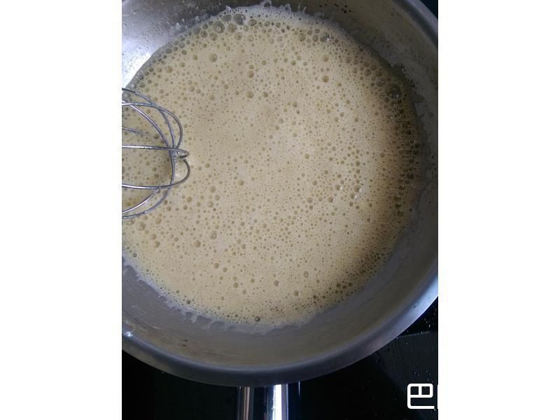 8分4~5次加入牛奶,刚开始会结块是正常的,必须将牛奶加至面粉不结块;以打蛋器迅速搅拌。