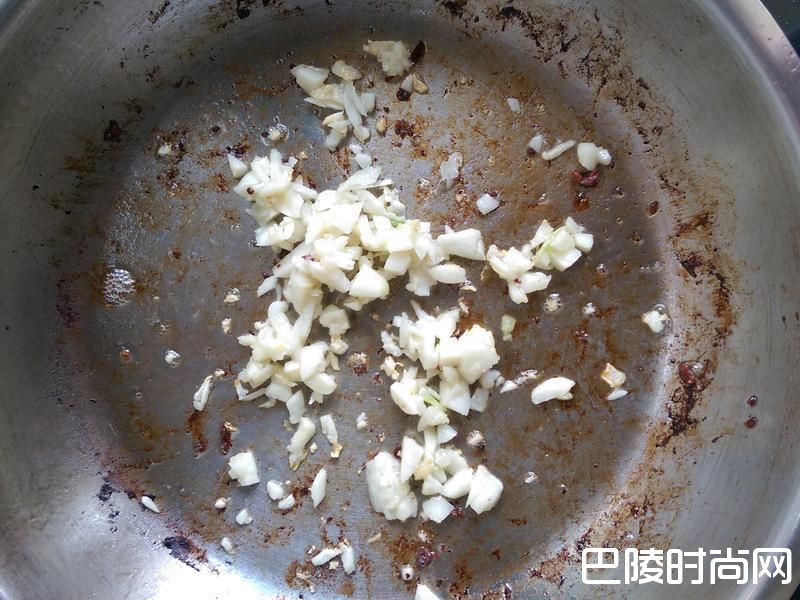 3将过多的培根油盛出,用剩余油爆香大蒜末。