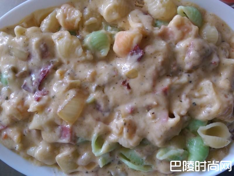 13将通心粉与酱料混和于烤碗。因为我没买到通心粉所以以贝壳面代替,但口感一样好。