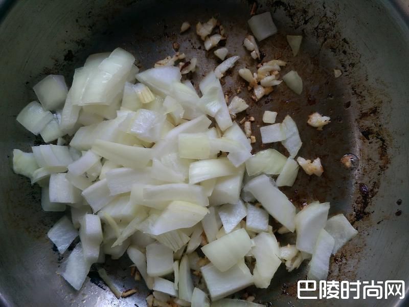 4放入洋葱丁(这时可开始煮通心粉),快起锅时再加入墨西哥辣椒末。