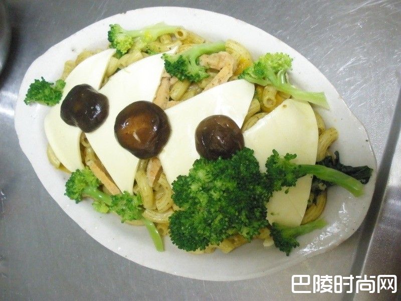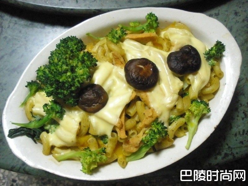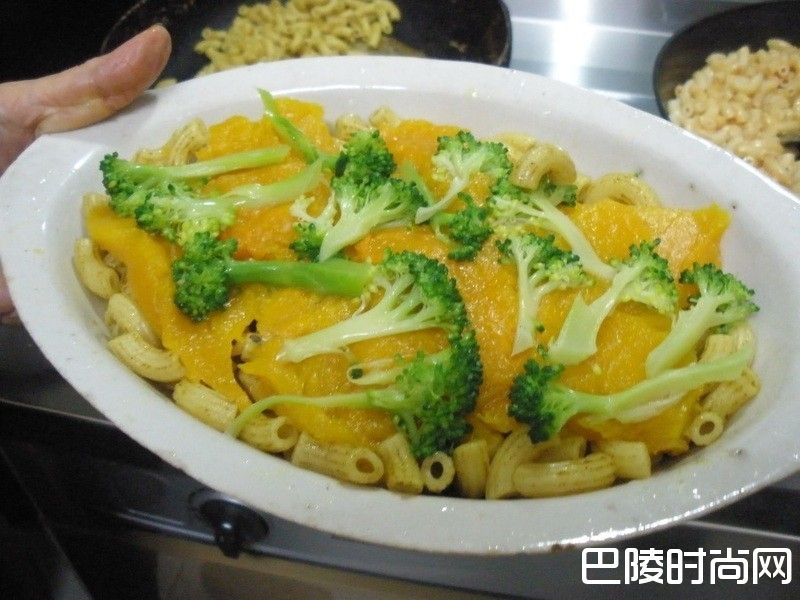 1( a ) 通心粉煮熟,捞起沥掉水分备用。( b ) 南瓜外皮洗净,切大块,放电锅蒸熟备用。( c ) 芝司乐起司斜切成三角形备用。( d ) 绿花椰洗净,分成小朵,加盐烫熟,捞起备用。( e ) 新鲜香菇洗净,去蒂,烫熟捞起备用。( f ) 素鸡块斜切成 0.5 cm 宽的条状备用。( g ) 若要加蛋,先在碗里打散备用。