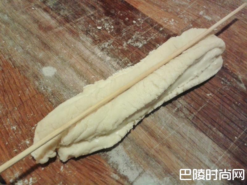 5用竹签在长方块面团压一条深痕,再用另一长方块叠在上面,再用竹签压一条深痕