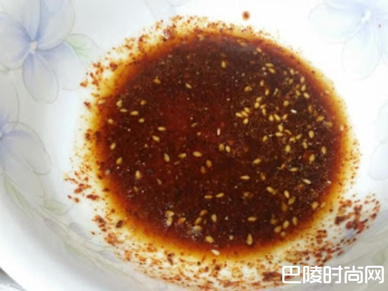 3凉拌的酱汁:酱油、辣椒粉、食醋、白砂糖、芝麻油、白芝麻均匀调和。