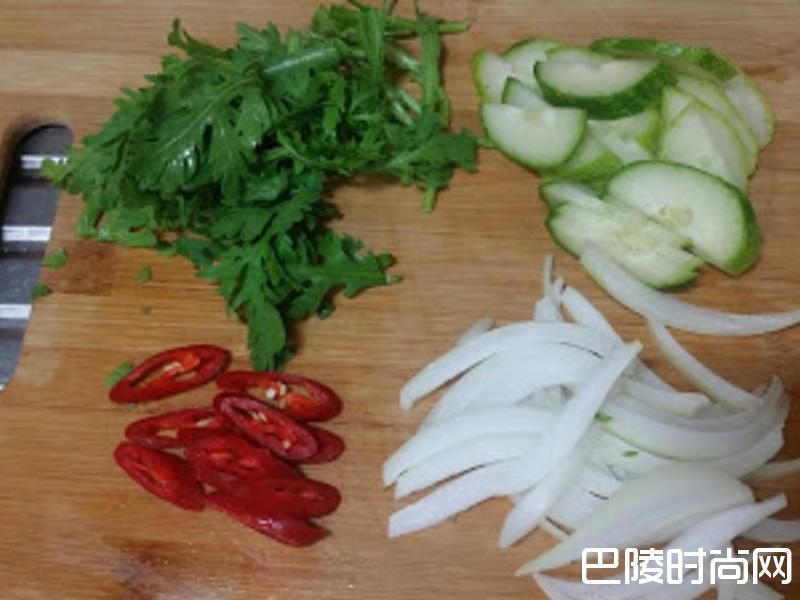 1草(韩国蔬菜的一种,不加也可以)切段,小黄瓜切片、洋葱切丝、辣椒切片备用。