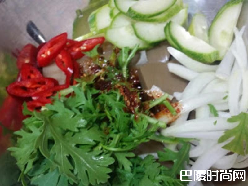 4调好的凉拌酱汁加到刚刚准备好的食材中。