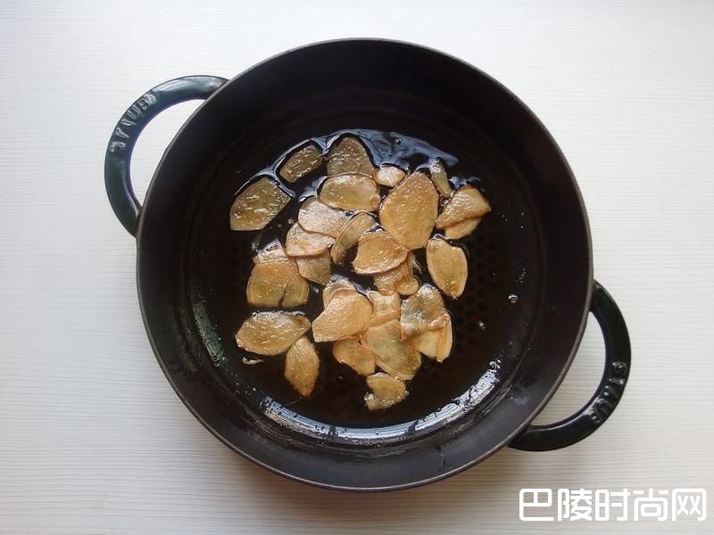 2加入麻油及姜片.使用小火慢慢煸香,煸至姜片卷曲状。