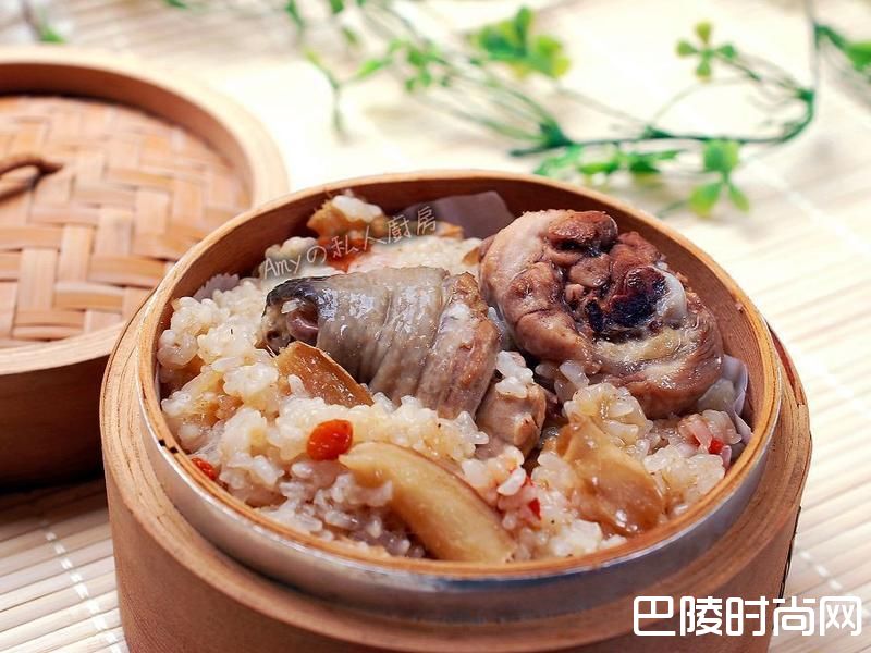 。糯米洗净沥干。鸡腿块先用滚水汆烫过备用。