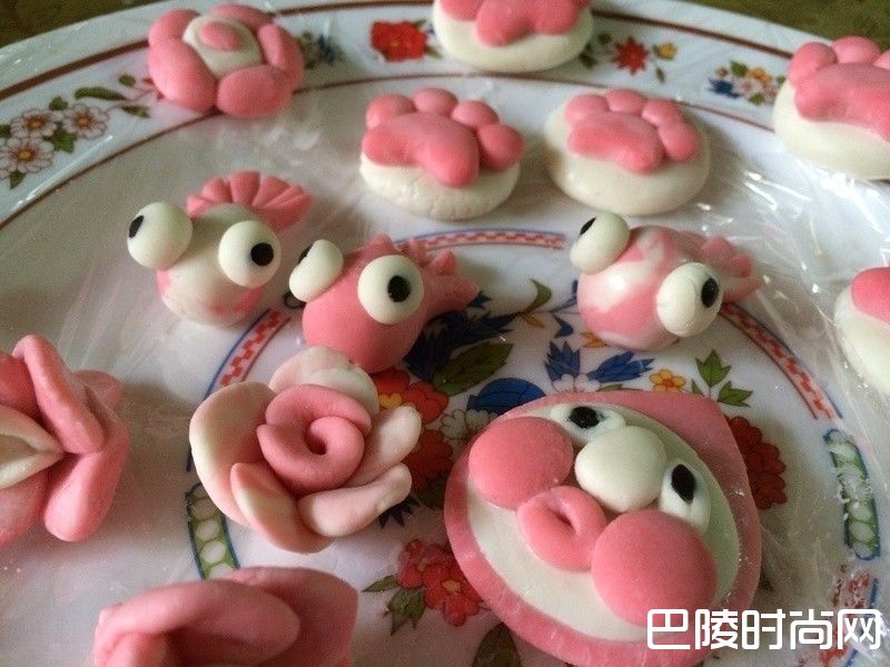 3接着开始使用糯米团开始制作想要的造型汤圆.造型汤圆特征在黏着时记得抹上一点水增加牢固性.
