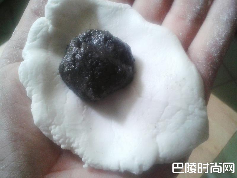 3取一份粉团,放入馅料,搓圆,放在沾有糯米粉的碟上