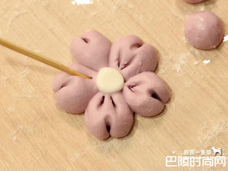 6⑤ 再如图示,从每朵花瓣的中心处往外,左右各压出两道刻痕。(压得稍深一些,以免下水煮膨胀后压痕消失)