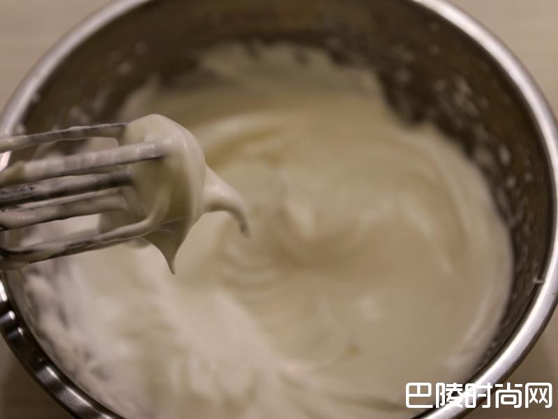 2开始打蛋白霜,用高速,将蛋白打发到体积膨胀 到三倍大,加入1/3 的糖和柠檬汁 ,继续将蛋白打到微微发白,搅拌时可以看出淡淡的纹路,加另外1/3 的糖,将蛋白霜打到完全变白,搅拌时已经有明显纹路,呈现一个弯勾(溼性发泡),加最后1/3 的糖,低速,一直打到蛋白霜非常绵密不流动,中性发泡即可。