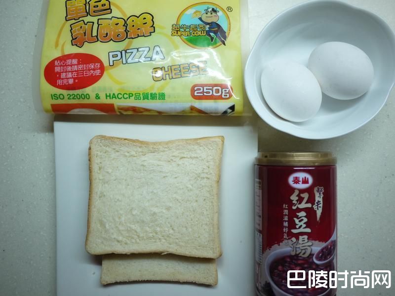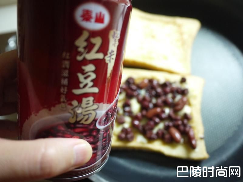6取出红豆(汤汁沥干)铺在吐司上,再放上适量的乳酪丝,盖上另一片吐司,开小火用锅铲轻压至二片吐司结合即可起锅切块享用!