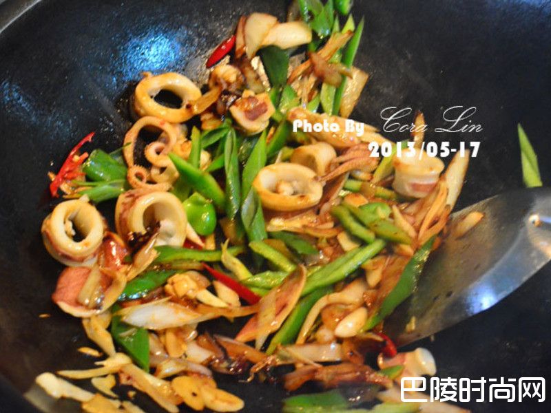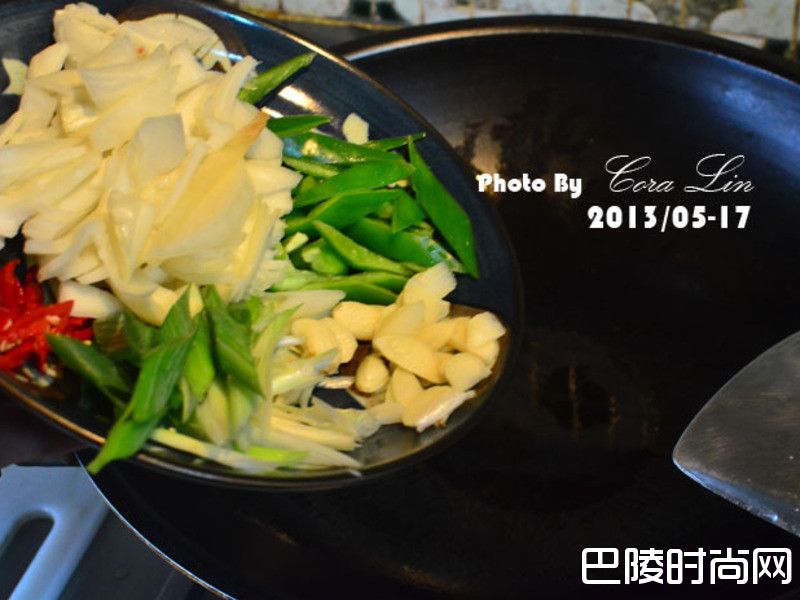 4去一片猪皮,逼出猪油。爆香蒜头、洋葱、葱、加入辣椒、青椒,火要非常的大。