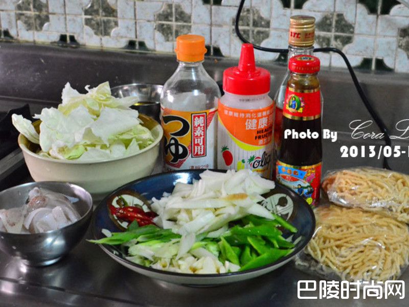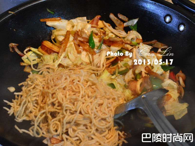 8把面与小卷,配菜、高丽菜,一起大火快炒。