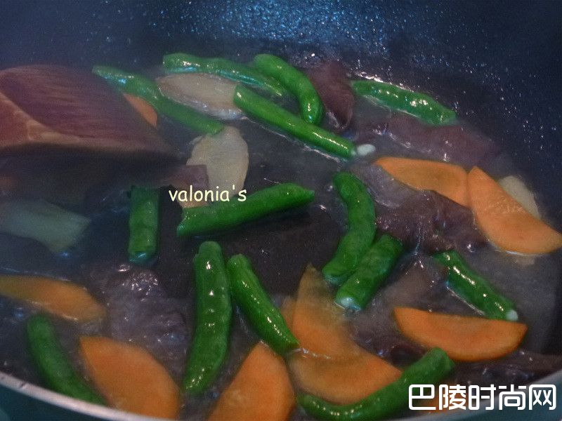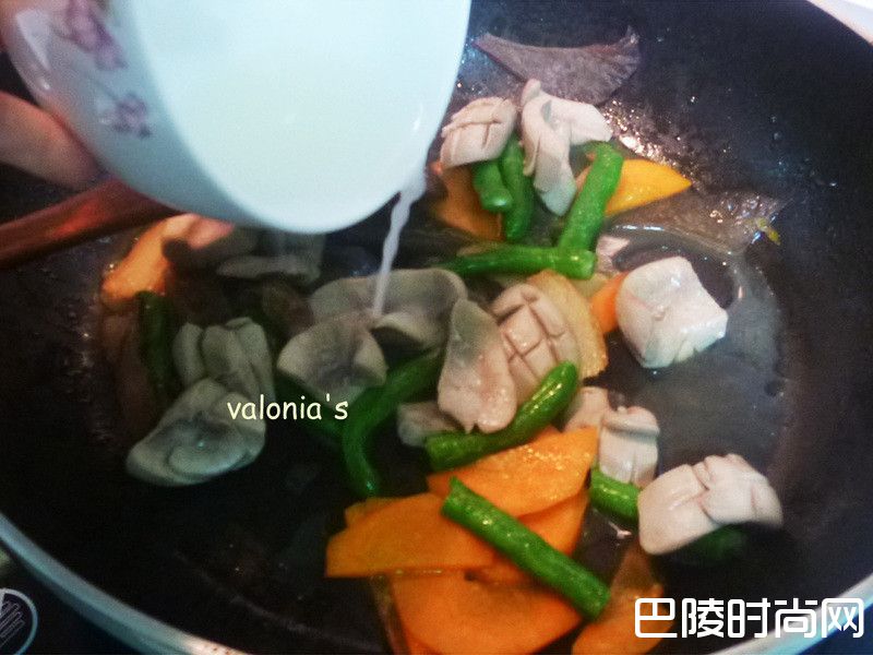 3热油锅,爆香姜片后,将长豆、红萝卜、黑木耳放进,翻炒一下。
