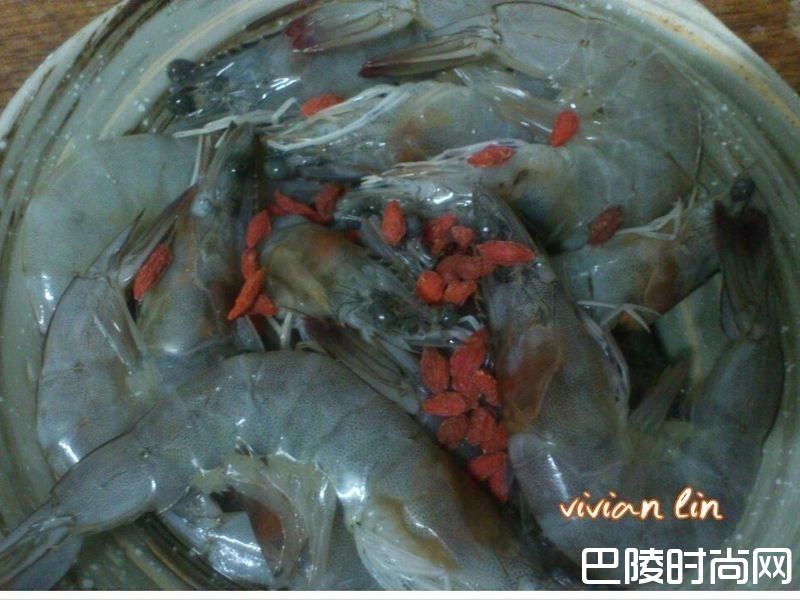 2将枸杞均匀的撒在虾子上.