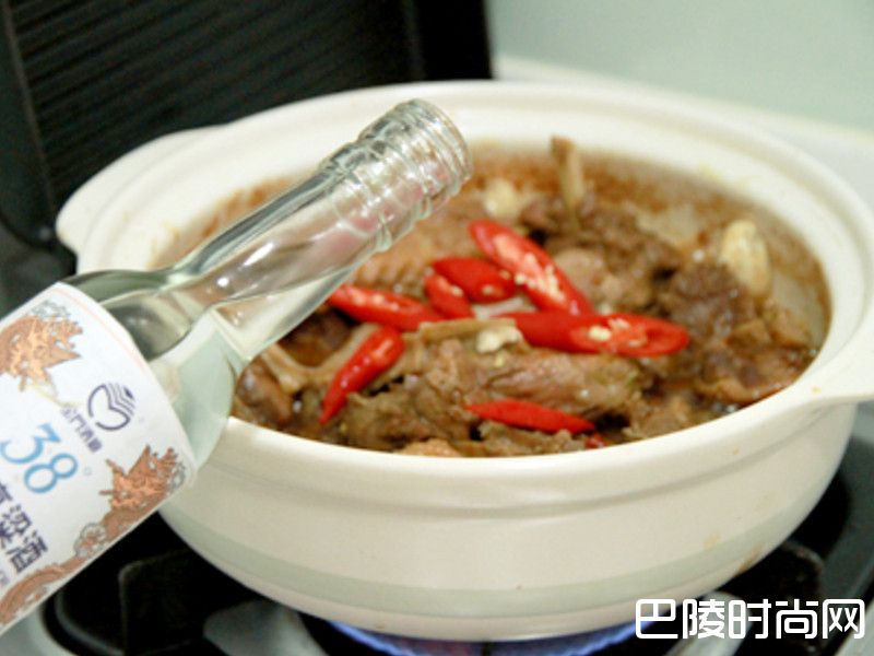 4待烧鸭肉软嫩后开砂锅盖小火将卤汁略为收干后,放入辣椒片及在锅边呛入38゚金门高梁酒后拌匀即可起锅完成。