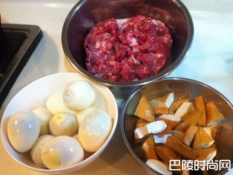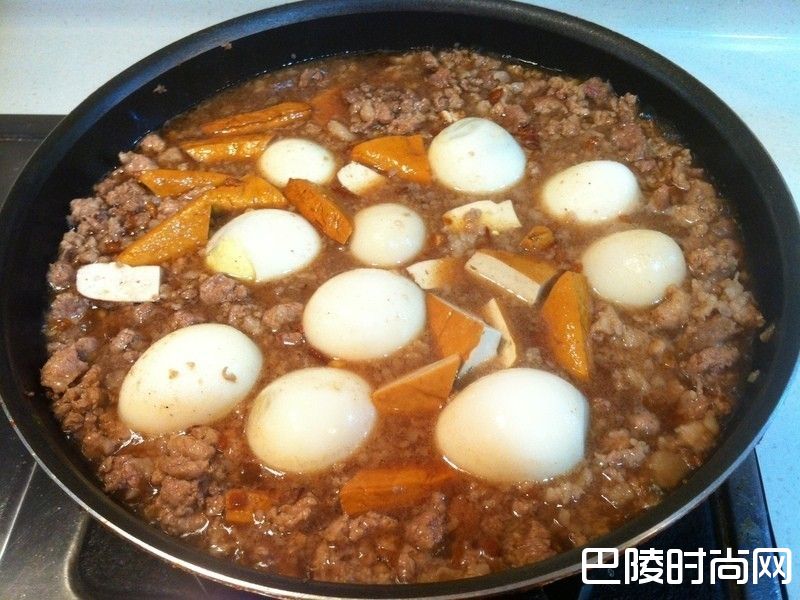 5依序加入卤汁后,拌炒让绞肉上色后..即可加入豆干,白煮蛋..待煮滚后转小火,盖上锅盖..闷煮20-30分钟..就完成囉!!