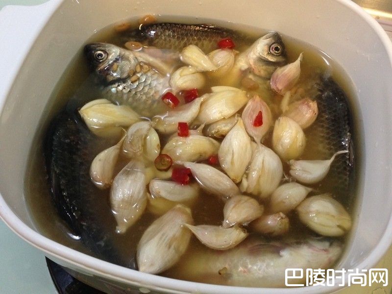 4鲫鱼本身土味很重,所以要加上大量的蒜头,喜欢吃辣可加点辣椒,等水滚了之后,转小火慢慢收汁.....