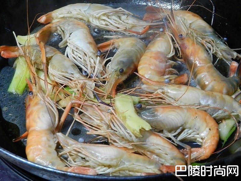 2香味出来后,将泰国虾入锅炒