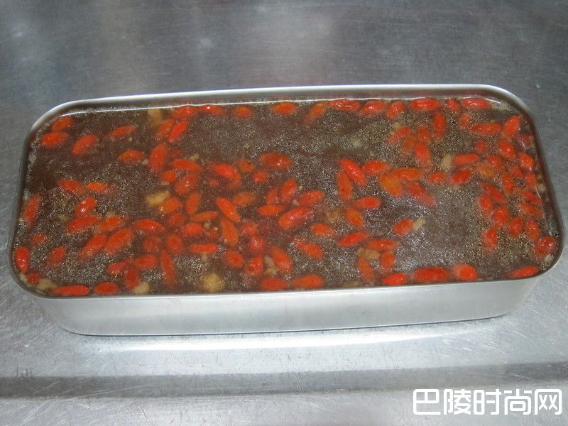 5枸杞洗干净;加枸杞续煮2分钟。倒入模型容器里。待凉冰冷藏结冻。约 小时。成水晶猪皮冻。