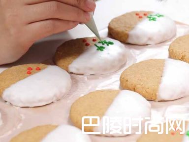 9将冷却的饼干,一半沾满淋面的白色糖霜,放在油纸上,待自然凝结后,用两个颜色的糖霜装饰,即成。