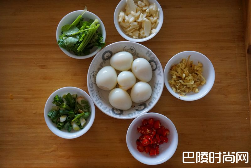 2.香菜切成段;香葱切成花;大蒜、老姜切碎;小米辣切成末;鹌鹑蛋提前煮熟剥壳待用