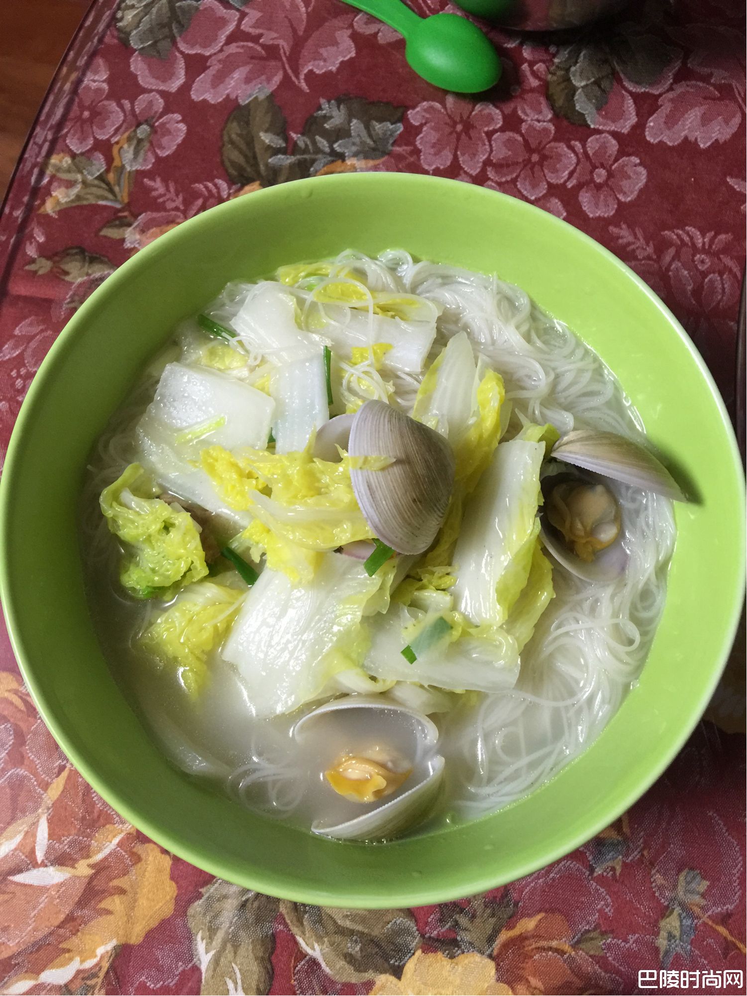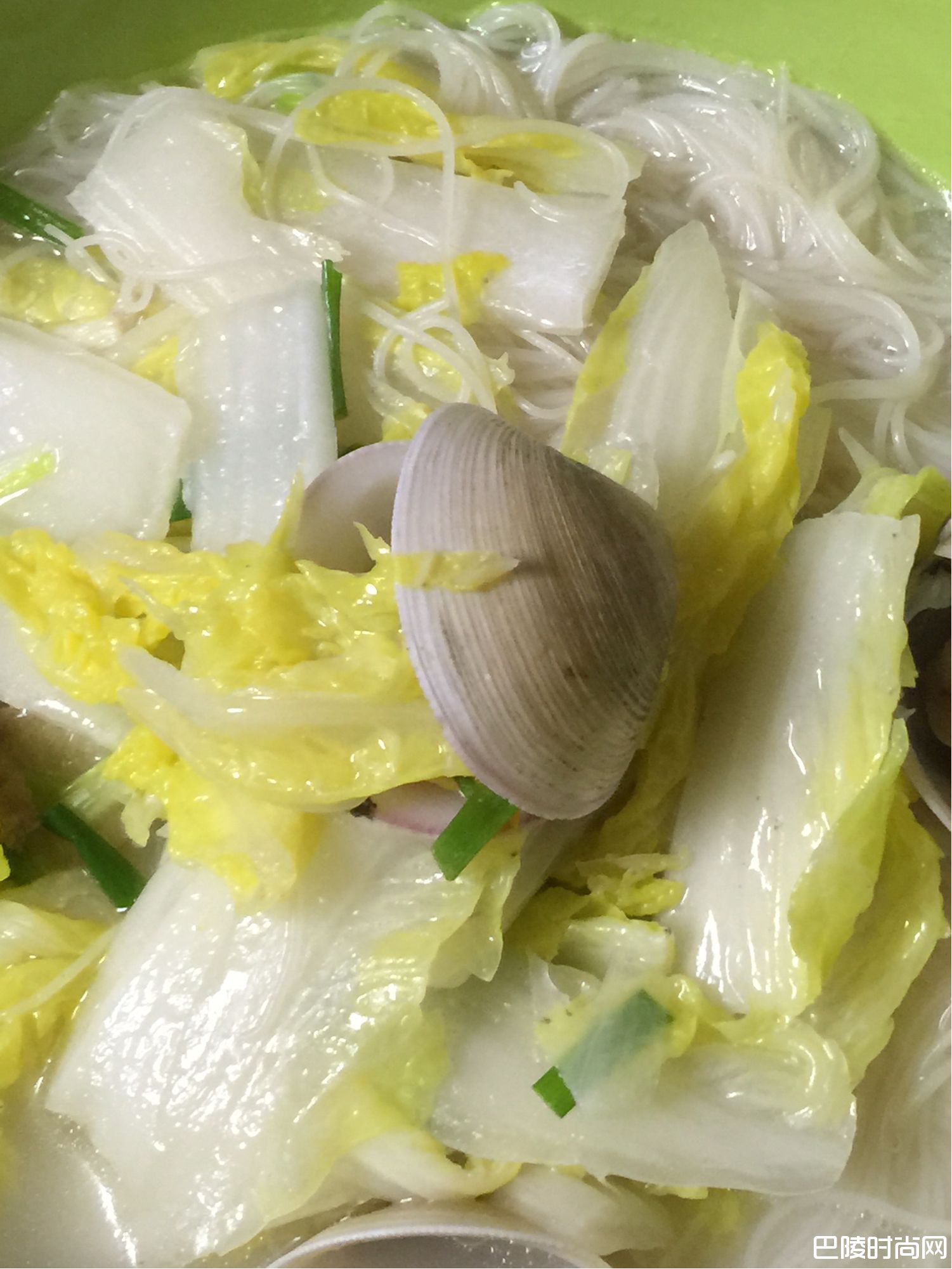 蛤壳汤米线米面75g、娃娃菜100g、蛤壳8只、适量葱花。