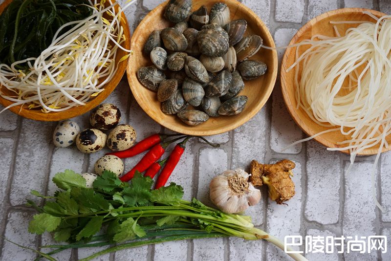 花甲米线米线80g、花甲100g、海带丝20g、豆芽20g、鹌鹑蛋6个、小米辣、老姜、大蒜、香葱、香菜、蚝油、生抽、料酒、白糖、盐、醋
