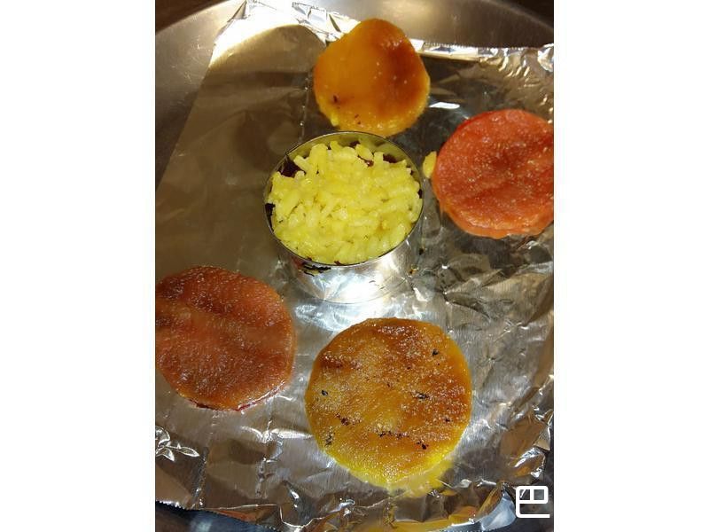 1先将义大利短米饭小火干炒后加入橄榄油,黄节瓜丁,绿节瓜丁炒软后加入蔬菜高汤,番红花,煮至8~9分熟调味,红甜椒,黄甜椒火烤后去皮调味,使用圆型模具裁切,依序摆上黄甜椒,番红花炖饭,红甜椒番红花炖饭,黄甜椒,番红花炖饭,红甜椒压扎实
