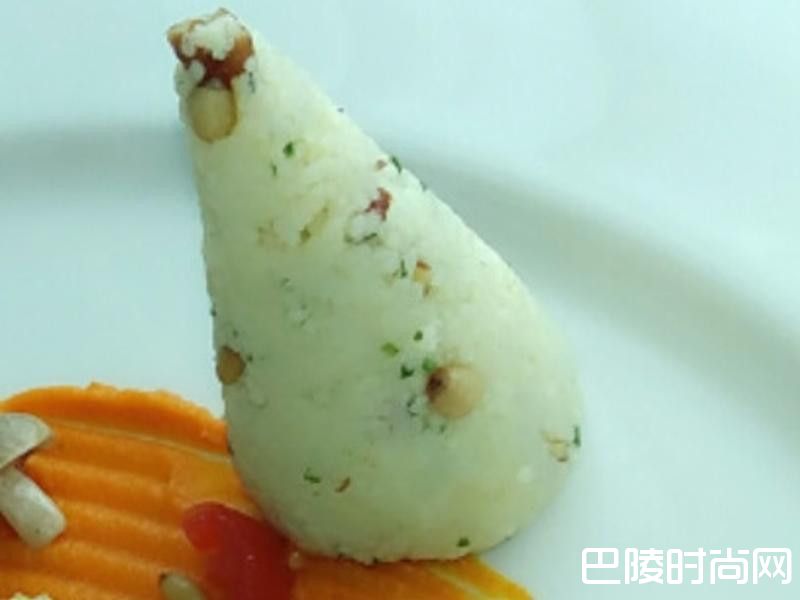 2蔬菜高汤煮沸后离火倒入北非小米泡熟,取一平底锅将松子炒香倒入北非小米 拌均调味加入百里香和巴西里调香后取一小挤花带,倒入北非小米朔型后到出