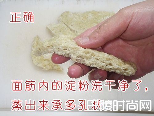 5.洗第3次,面筋的状态(图8)洗到换水第5次时,面筋会变成粗糙多孔的状态,而面水不再变白(图9)就说明洗完全了。