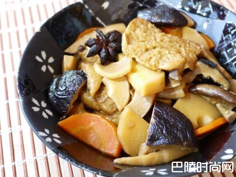 3锅中放油,将烤麸加姜,先稍微炒乾,加入香菇拌炒后,放入红萝卜,盐、酱油、水1碗,稍拌炒再放入杏包菇,稍煮入味,即可起锅