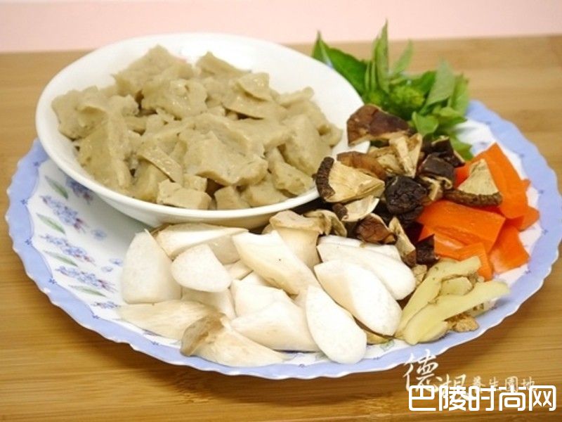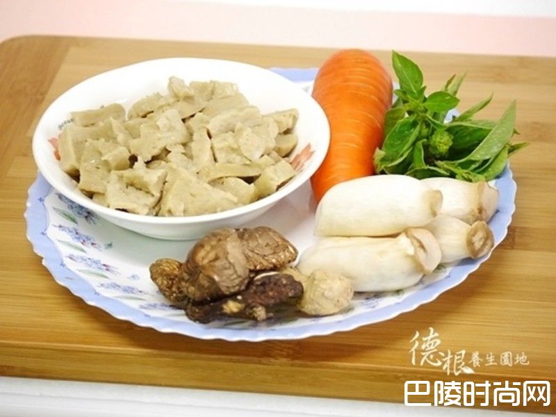 洗净,烤麸切块,香菇切片、红萝卜、杏包菇切滚刀块,姜切片