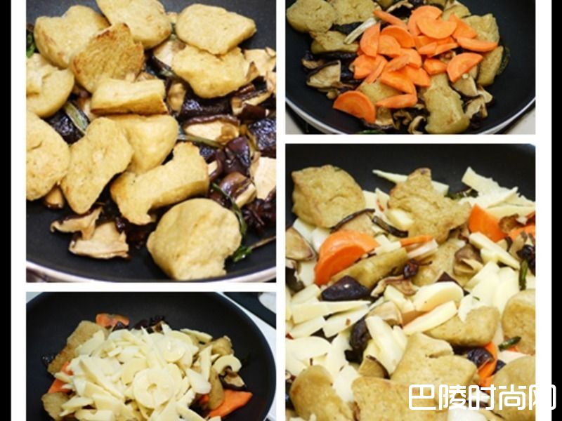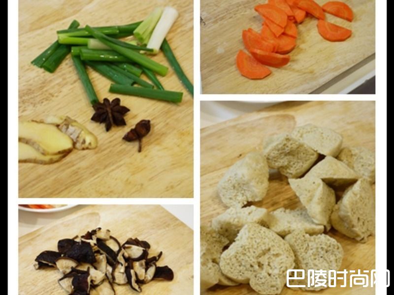 3葱切大段,葱白葱绿分开、姜与红萝卜切片、 泡好的干香菇洗净皱褶内的脏污后一切四、烤麸对角切二、八角冲一下水备用