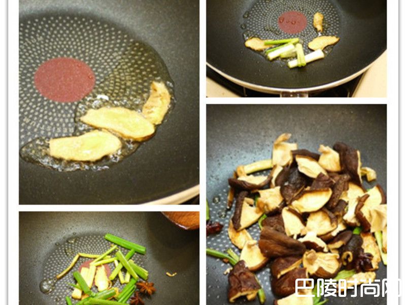 5同一锅,同样放入一匙香油与炒菜油后开中小火,放入姜片爆香至香味出来后, 放入葱白煸炒至葱白变焦香。再放入葱绿、八角与香菇一起拌炒至香味出来。