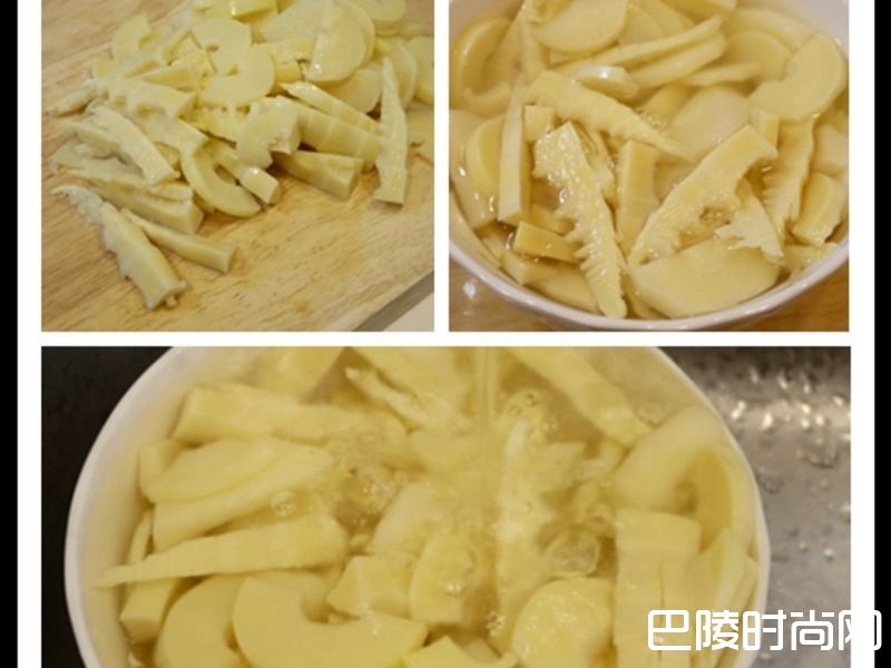 2笋子切片后泡热水,之后再用冷水清洗。 (会有这样的步骤是因为笋子不是买新鲜的回来自己煮,多多少少有点怪味或酸味。 用热水烫过后再用冷水清洗把这些怪味去掉。 如果在夏天笋子当季的时候买新鲜的笋子回来自己煮,就不用这道程序)