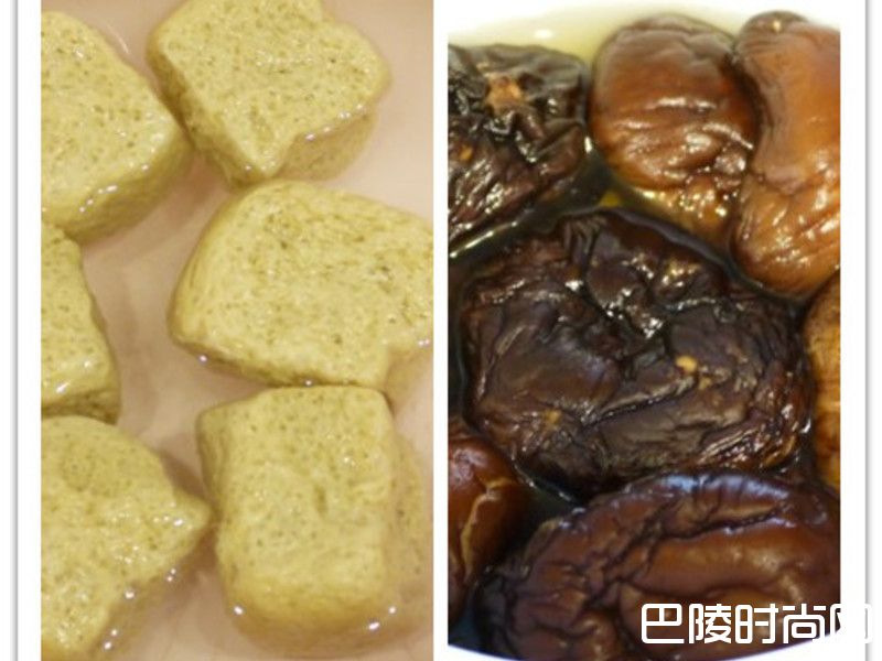 1香菇泡水、烤麸在水中挤压,冲洗几次,后挤干水分备用