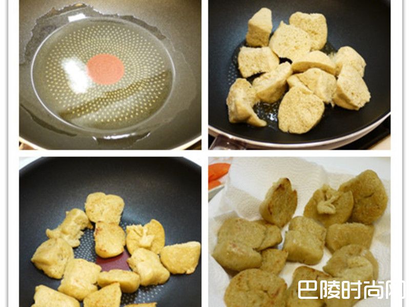 4取一锅,内放一大匙香油与炒菜油开中小火,油热后放入烤麸煎至表面焦香后取出吸油。