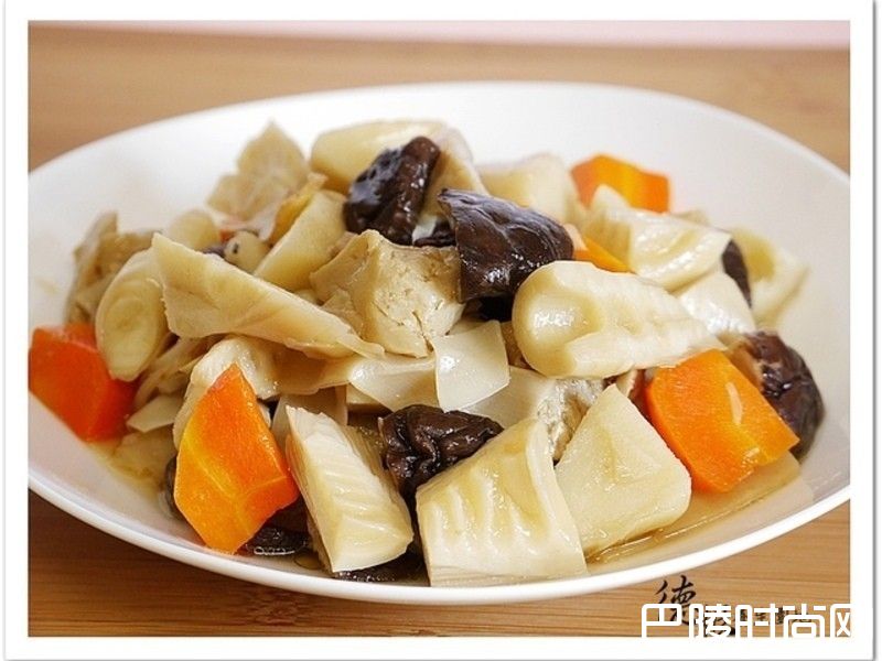 随后放入煎好的烤麸、红萝卜片与笋片一起拌炒个几下