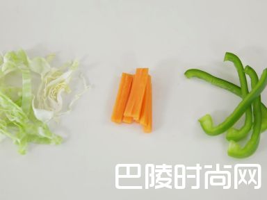 2卷心菜切丝,青甜椒切条,胡萝卜切丝;