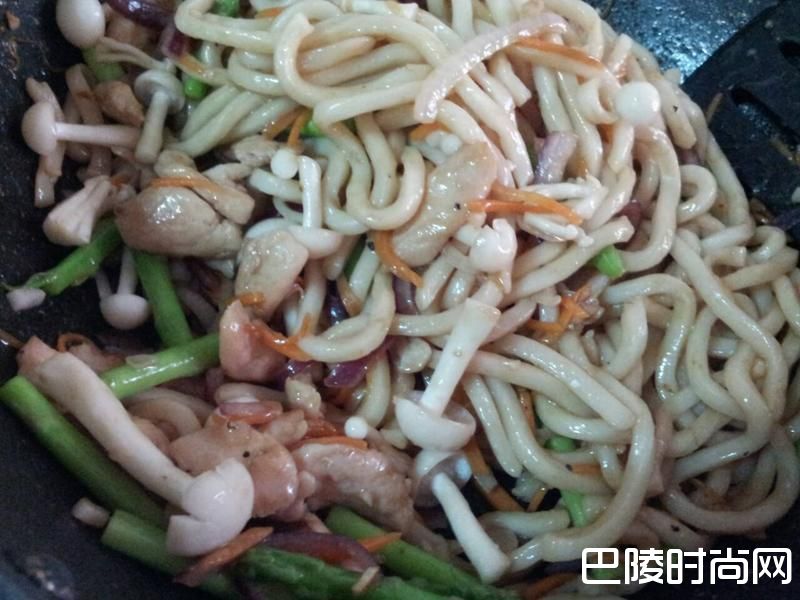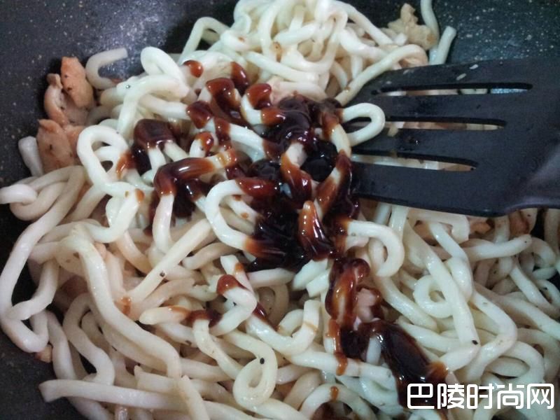 加入鸡肉和乌龙面拌炒