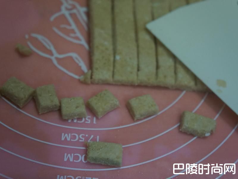 2将成团的粉团用杆面棍压平后,在切成宽1cm的条状.切成条状的粉团在切成小方形