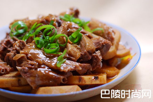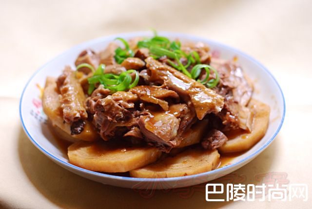 3、另起镬放油将切好的葛略炒后加入清水,再放入煎过的鹅,加生抽、老抽和白糖,加盖炆至谂后放盐调味。