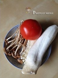 蘑菇莜面鱼鱼莜面300g,杏鲍菇80g,金针菇80g,茶树菇50g,葱1根,油适量,葱姜蒜粉1大勺,西红柿1个,酱油2大勺,